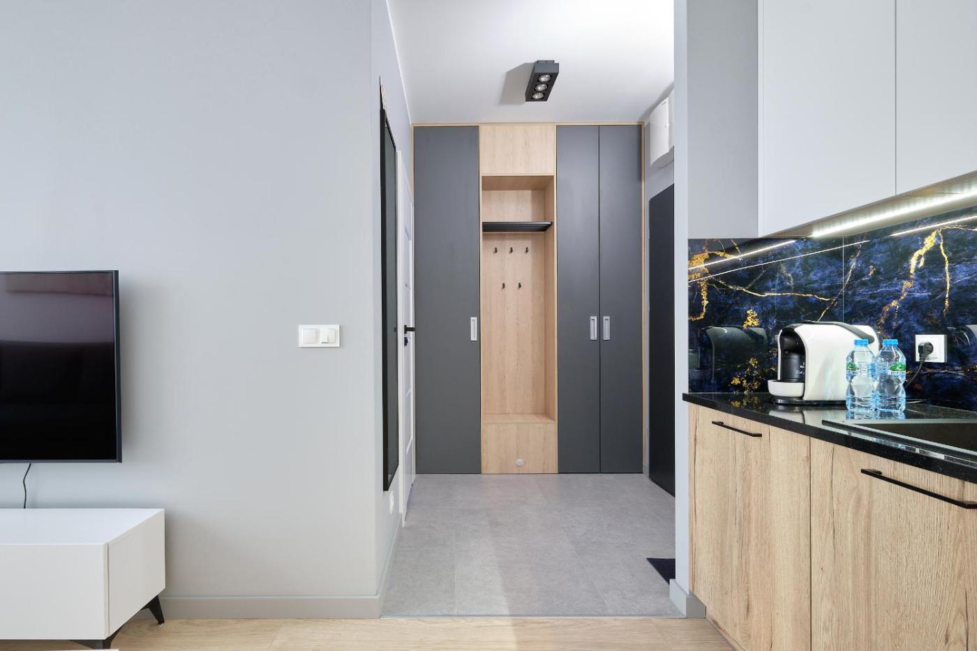 Oferta apartamentu obejmuje sypialnię (1), salon, kuchnię z pełnym wyposażeniem, w tym lodówką i ekspresem do kawy, a także łazienkę (1) z prysznicem oraz suszarką do włosów. W apartamencie zapewniono ręczniki i pościel.